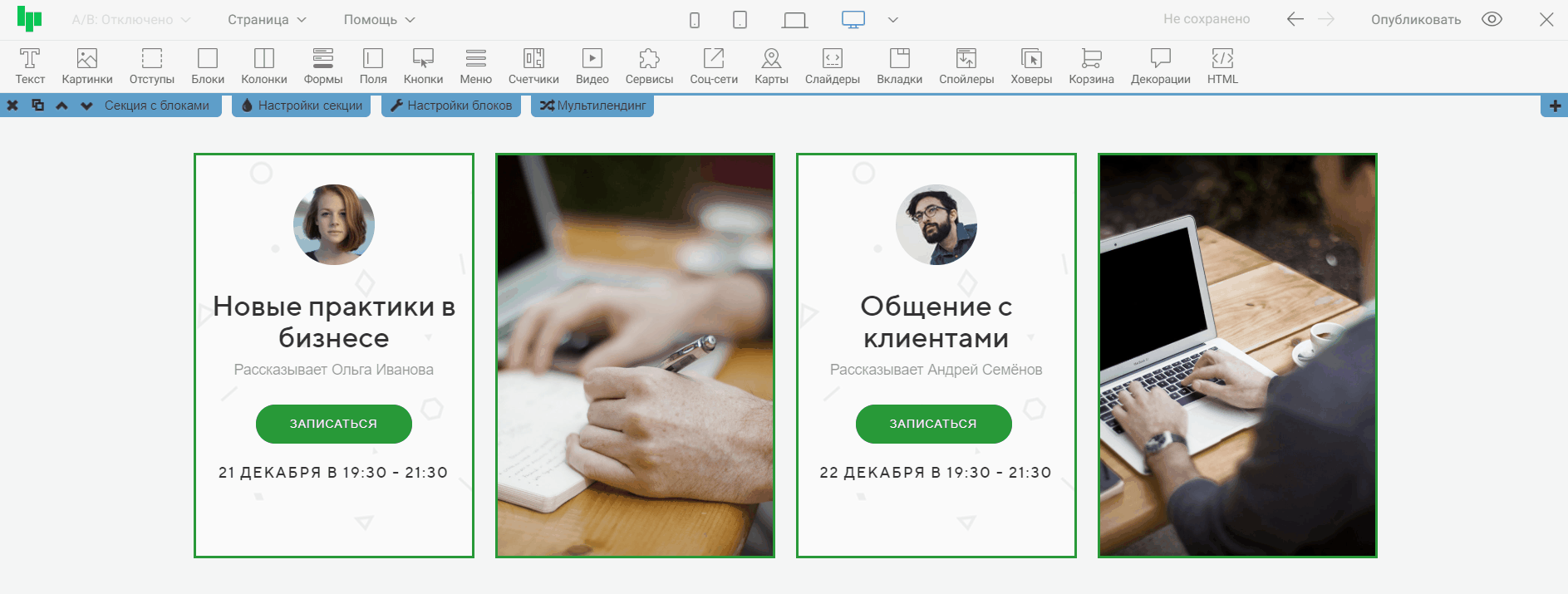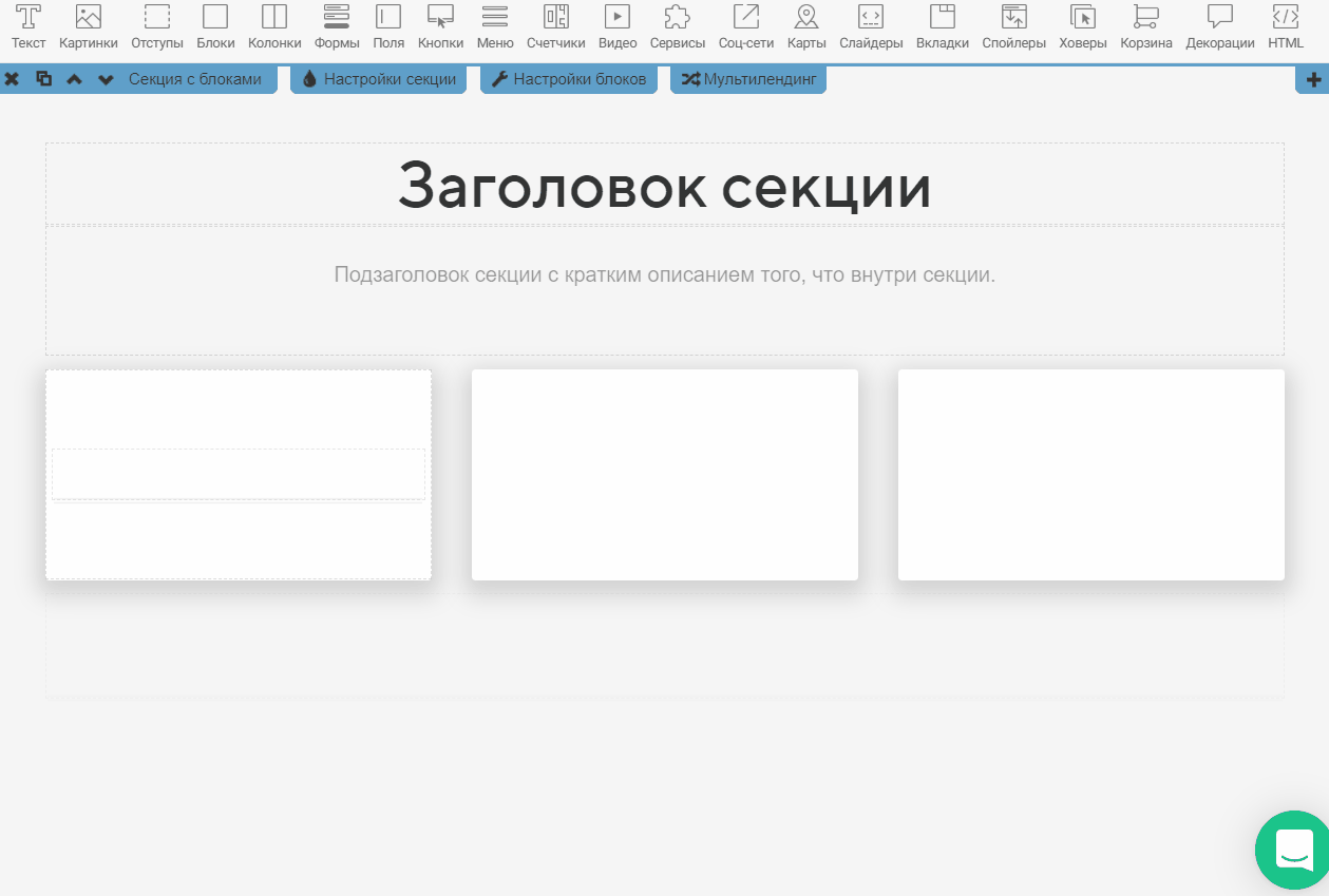 Секция «Набор блоков » представляет собой область страницы с фиксированными ячейками - блоками, которые можно наполнить любыми виджетами из панели инструментов.