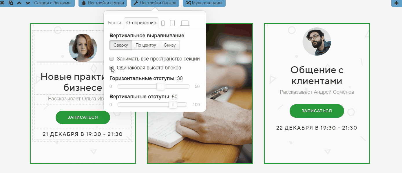 Не всегда получается разместить нужную информацию так, чтобы блоки были примерно одинаковыми по высоте. На помощь приходит настройка «Одинаковая высота блоков ».