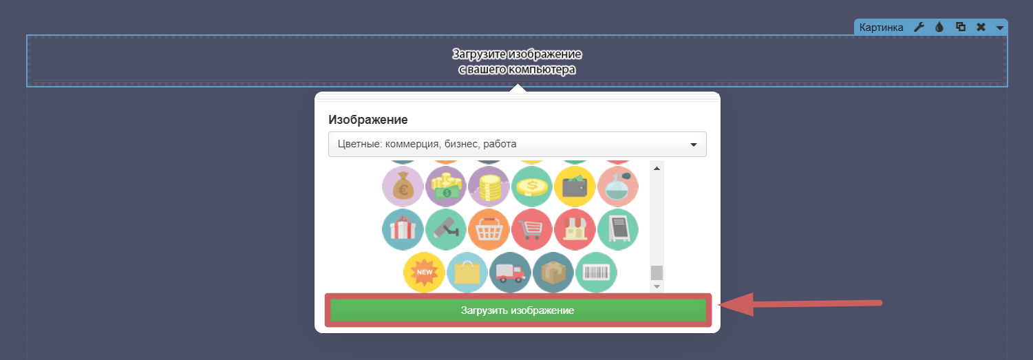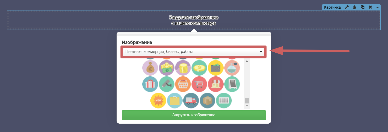 Шаг 2. Нажимаем на «Загрузите изображение с вашего компьютера ». У нас открывается окно, где можно выбрать иконку со стандартной библиотеки, или загрузить свое изображение. Есть несколько разных библиотек, в которых можно выбрать иконки в разном стиле: