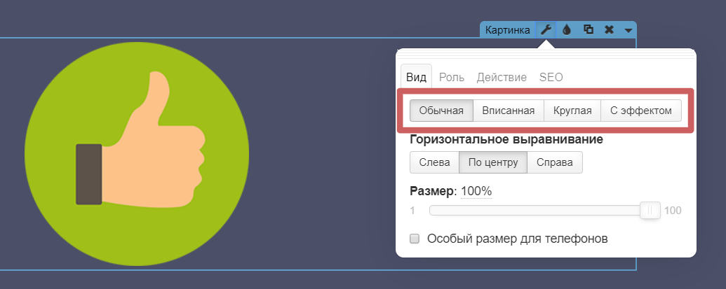 С эффектом. Эта функция позволяет добавлять эффекты на картинку, при наведении на нее. Подробно об этом в нашей инструкции: «Как настроить картинку с эффектом? »