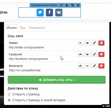 Теперь кнопка в виджете с иконкой VK ведет на нашу группу. Так же добавляются другие социальные сети.