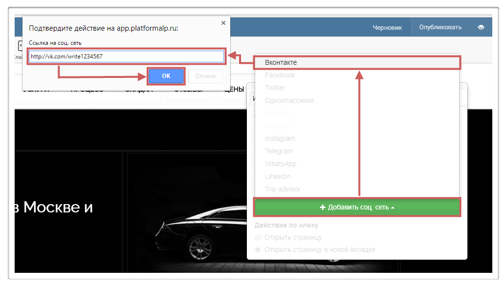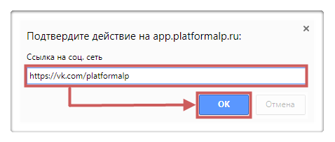 Шаг 4. Вставим ссылку на нашу группу https://vk.com/platformalp и нажмём «ОК».