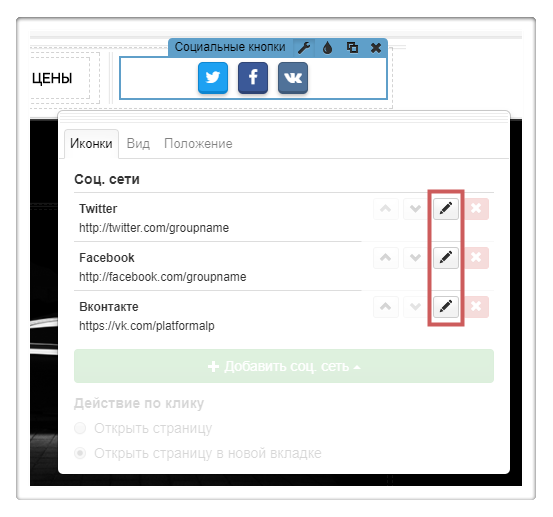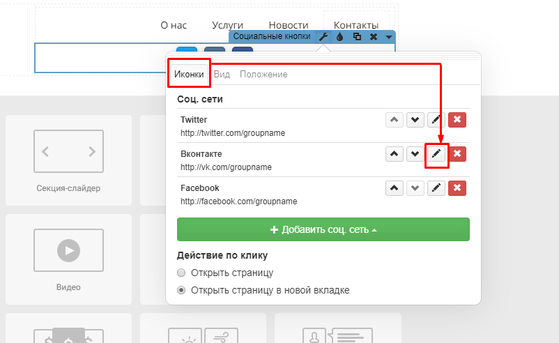 Шаг 2. Откроем «Настройки» виджета, вкладку «Иконки» и нажмём кнопку редактирования «ВКонтакте».