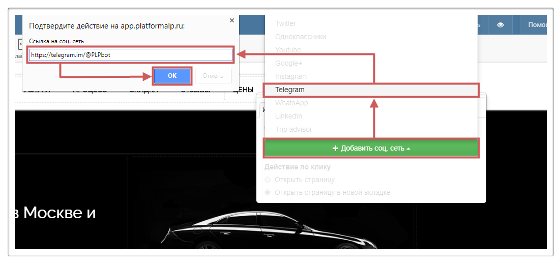 Шаг 2. Создадим новую социальную сеть Telegram и в поле «Ссылка на соц. сеть» укажем созданную ранее ссылку https://telegram.im/@PLPbot