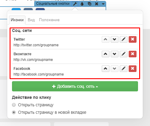 В настройках виджета можно добавлять, редактировать или удалять социальные сети.