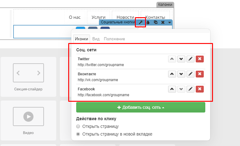 При нажатии на иконку посетитель перейдет по указанной ссылке, которая откроется в новой вкладке.