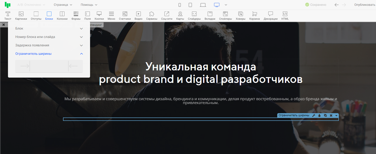 Шаг 3. Настроим нужную нам ширину и положение виджета «Ограничитель ширины » для отображения виджета «Текст ».