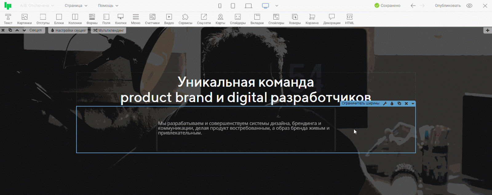 Шаг 1. Добавим на секцию виджет «Ограничитель ширины ».