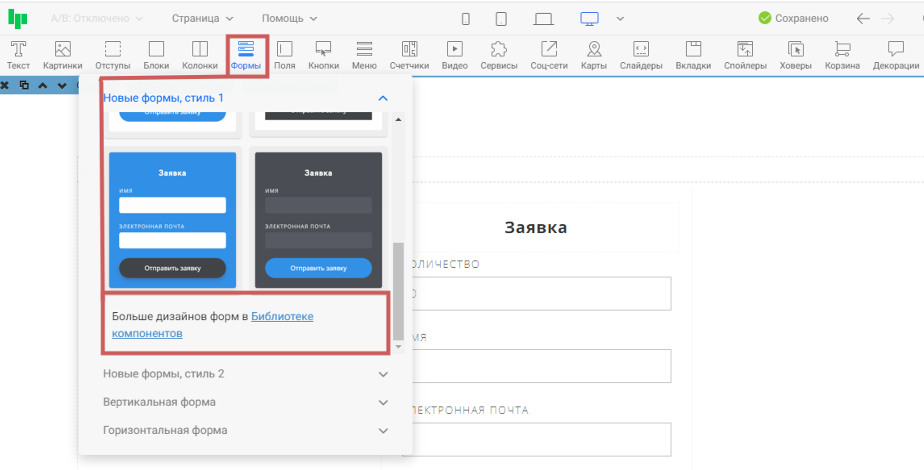 В редакторе страниц вы можете найти ссылки на библиотеку компонентов, в которой содержатся нестандартные виджеты.