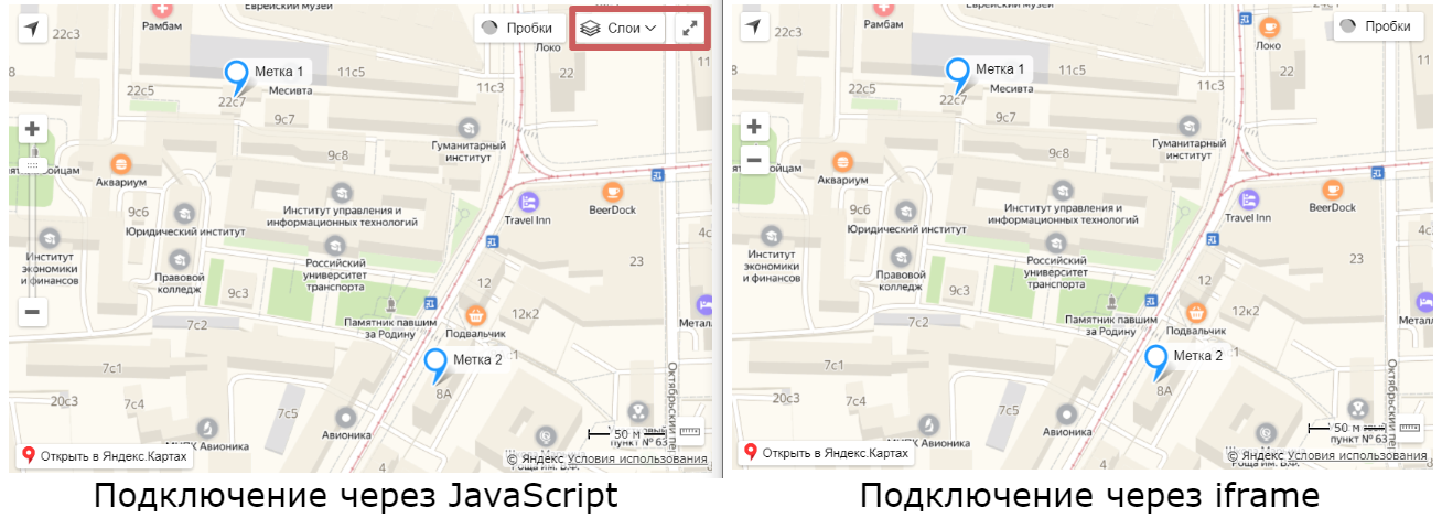 При подключении через JavaScript мы видим в правом верхнем углу карты есть кнопки, чтобы изменить слои карты (отображение карты со спутника или в виде схемы) и открыть карту на весь экран.