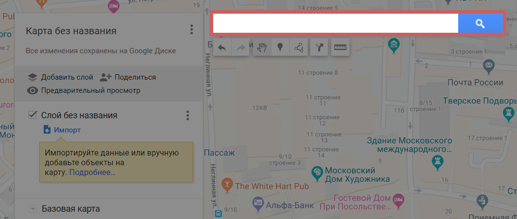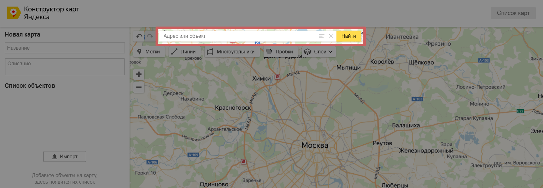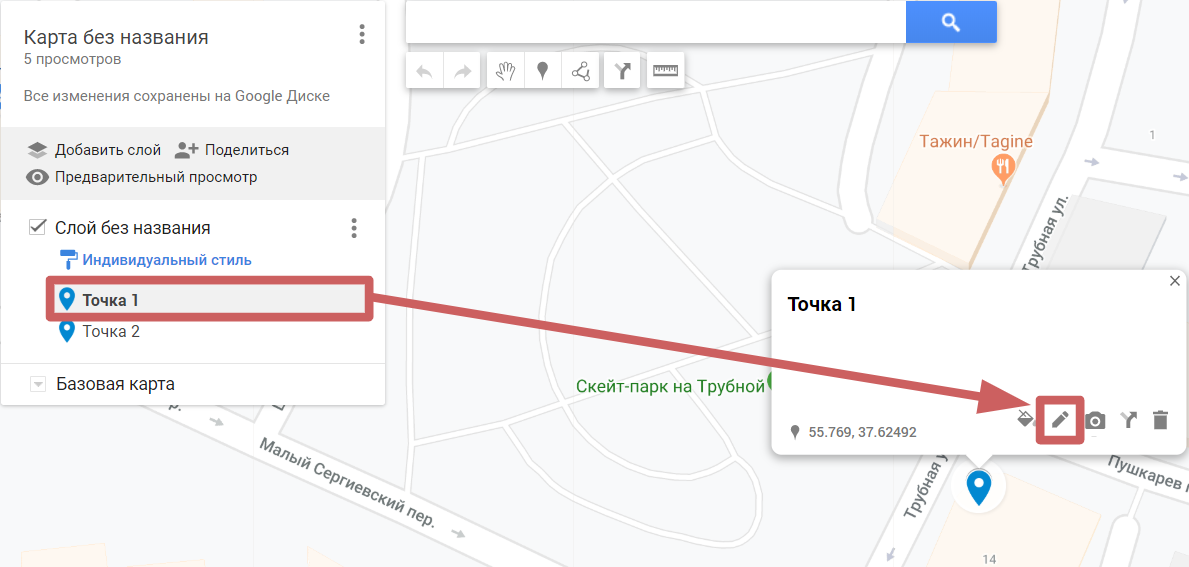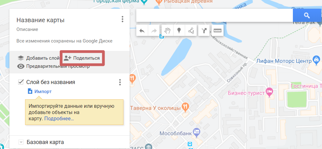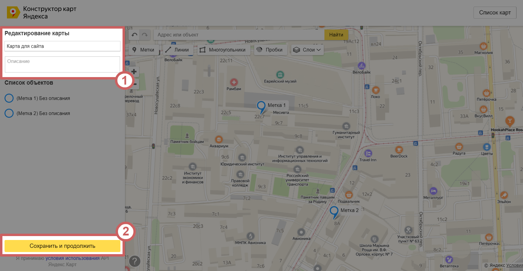 2. Более сложный вариант. Нужно выполнить больше действий и настроек, но с помощью него можно поставить несколько меток, линий и других элементов на карту.