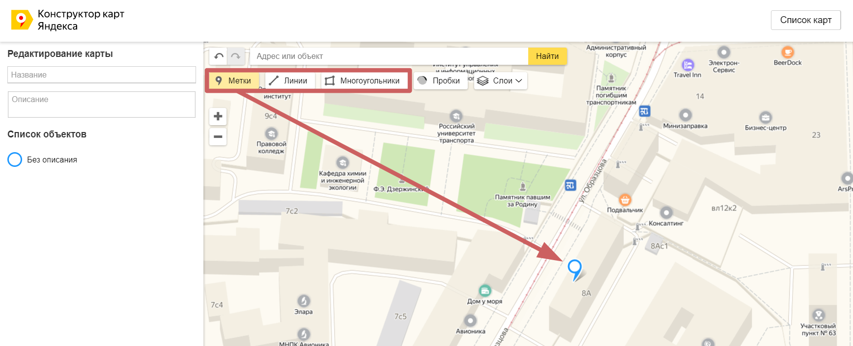 - Отметим на карте нужные нам адреса. Можно поставить несколько меток, а также по желанию добавить линии. Для этого нажмите на нужную функцию в верхней панели управления, после чего нажмите на нужное место на карте, чтобы поставить там метку или начать рисовать линию.