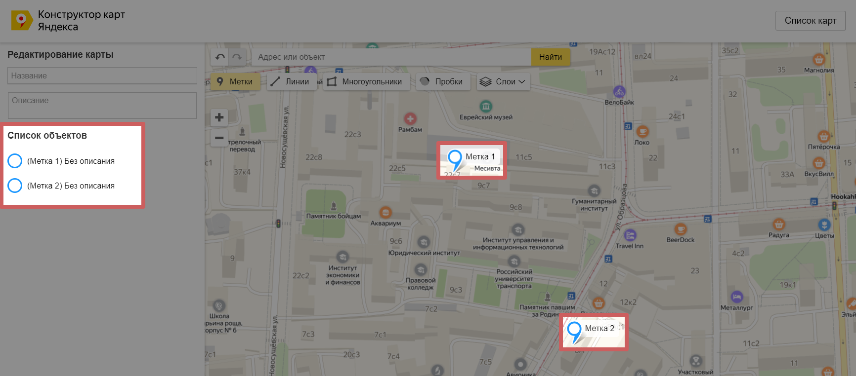 После добавления метки или линии, они добавляются в раздел «Список объектов» слева