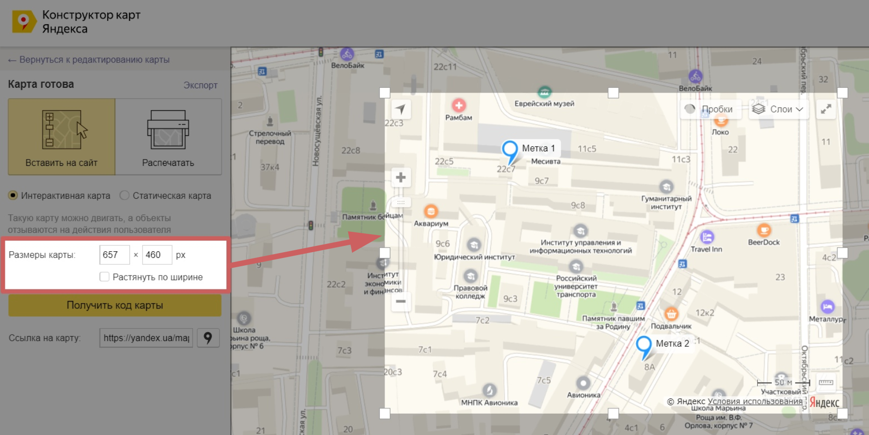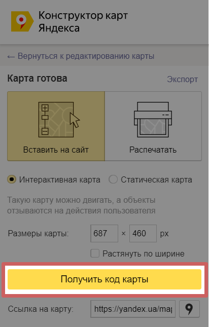 - Выбираем вариант «Вставить на сайт» и «Интерактивная карта»