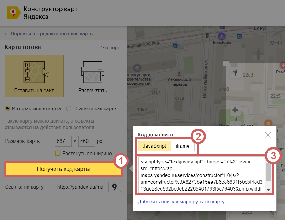 - Выберите вариант подключения карты (через JavaScript или iframe) и скопируйте полученный код