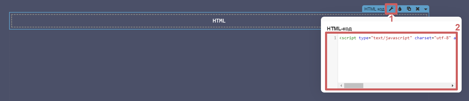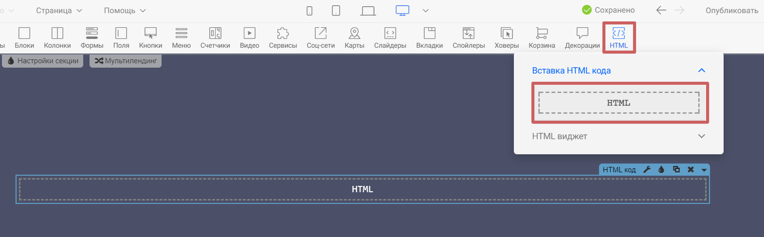 - Шаг7. Заходим в редактор и добавляем на страницу виджет «Вставка HTML кода».