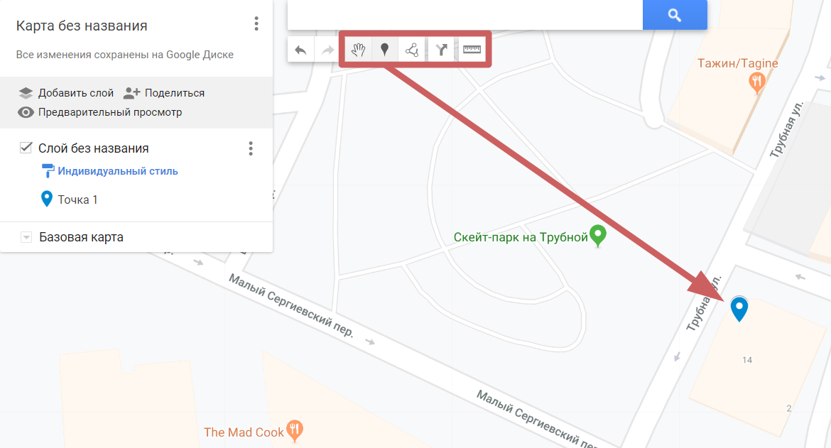 - Отметим на карте нужные нам адреса. Можно поставить несколько меток, а также добавить линии. Для этого нажмите на нужную функцию в верхней панели управления, после чего нажмите на нужное место на карте, чтобы поставить там метку или же начать рисовать линию.