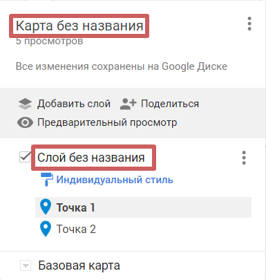 После добавления метки, линии или другого объекта, они также добавляются в раздел списка объектов слева (внутрь слоя). Слоев может быть несколько, и в каждом из них разные объекты. Но зачастую такой необходимости нет и вы можете оставить все объекты в одном слое, который изначально существует, и его не нужно создавать отдельно. В каком-то роде, слой выполняет функцию папки, в которой находятся объекты (объекты - это точки на карте, линии и т.д.).