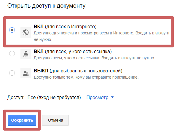 Выбираем вариант «Вкл (для всех в интернете) » и сохраняем настройки