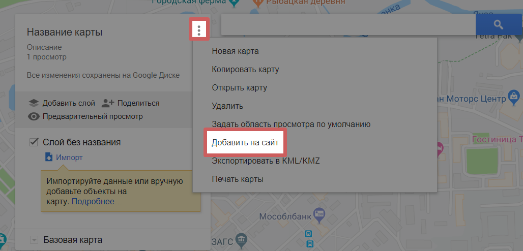 - После настройки доступа, нажимаем на иконку троеточия возле названия карты и на функцию «Добавить на сайт»