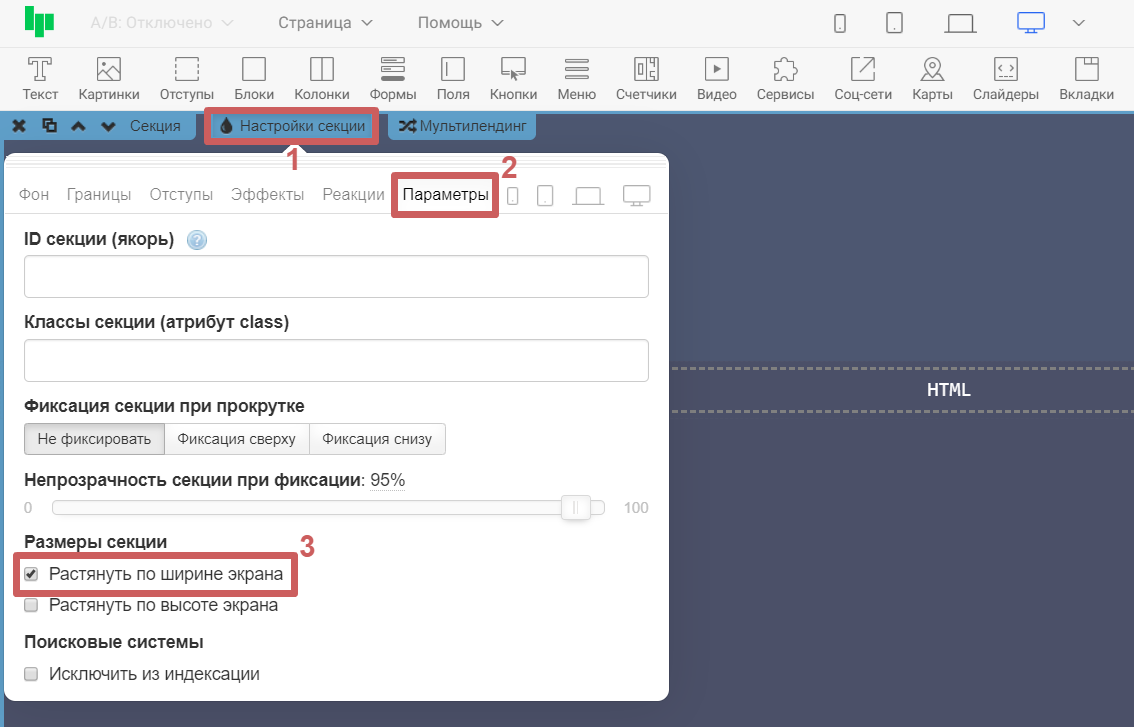 Для того чтобы растянуть границы виджета с картой на всю ширину экрана, необходимо зайти в настройки секции, внутри которой мы добавили карту, и в разделе «Параметры» включить функцию «Растянуть по ширине экрана »
