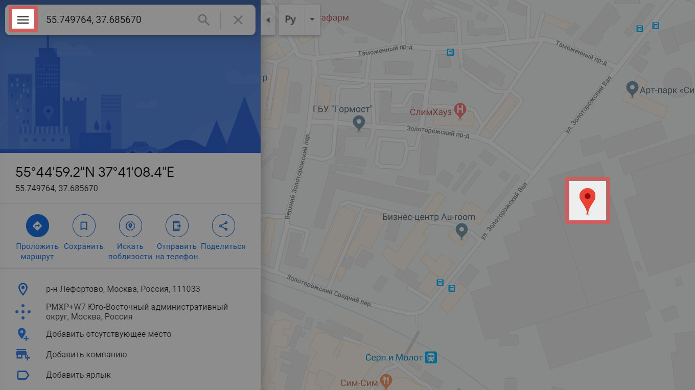 - Шаг4. Метка станет большой и красной. Далее нажмите на иконку трех полос в панели управления слева, чтобы зайти в настройки карты
