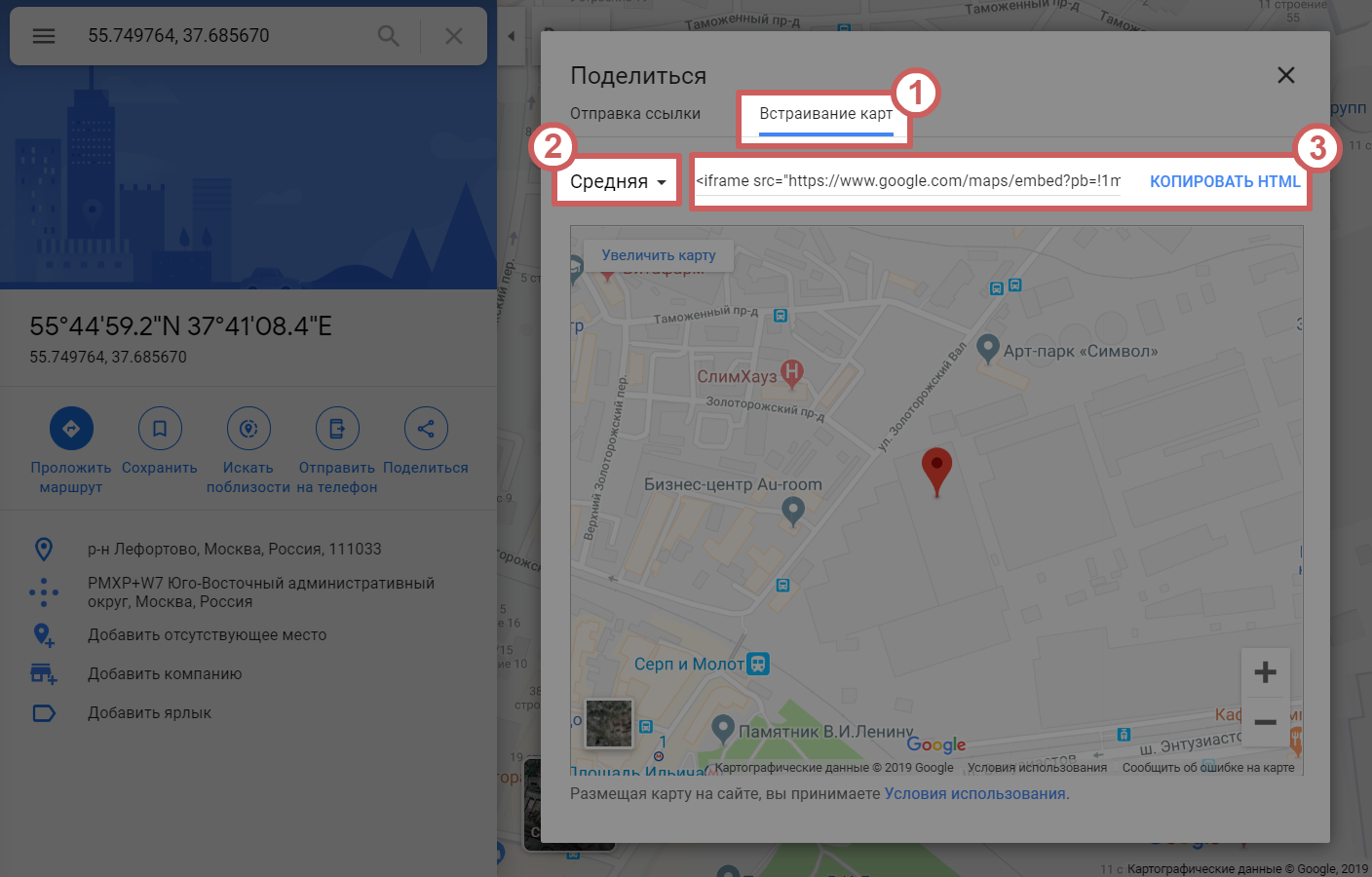- Шаг6. Выбираем вариант «Встраивание карт», выбираем размер карты, в котором хотим видеть ее на странице и нажимаем на кнопку «Копировать HTML»