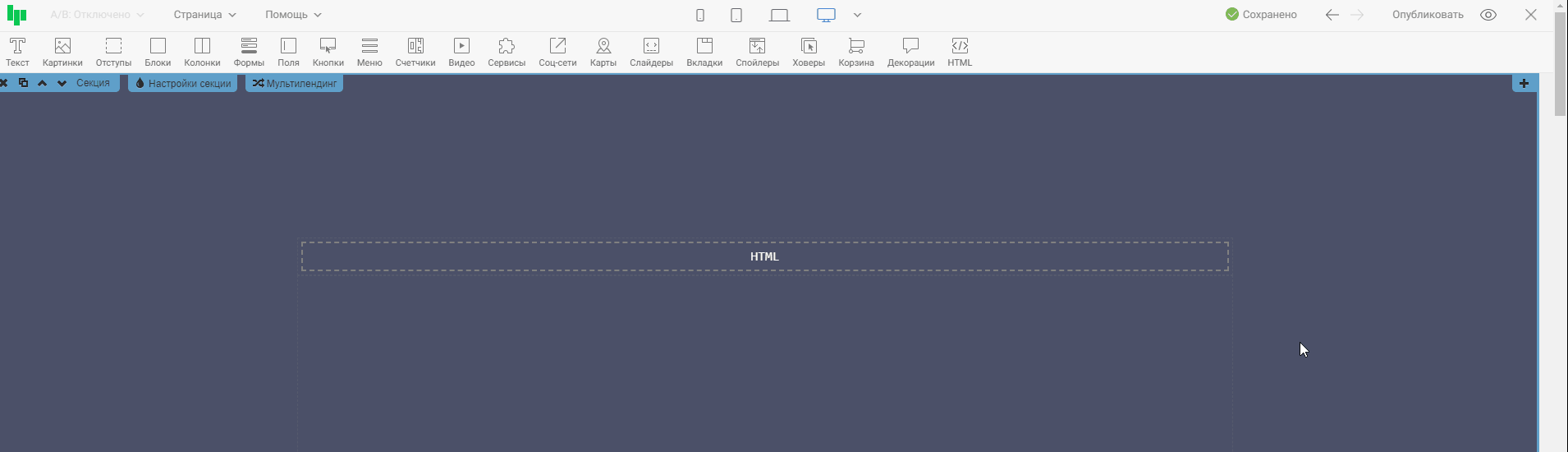 ❗Обратите внимание, что с помощью стандартных возможностей на страницу можно добавить только карту от сервиса Яндекс. Если ваши посетители будут с Украины, то у них такая карта работать не будет, поскольку на данный момент в Украине сервисы от Яндекс блокируются. Вместо Яндекс.Карты, можно подключить Google карты с помощью кода. Для добавления карты через код двигаемся дальше.