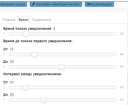 В настройках времени задаём сколько секунд будет отображаться уведомление, диапазон до показа первого уведомления и диапазон между следующими уведомлениями.