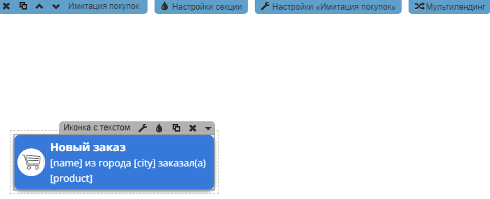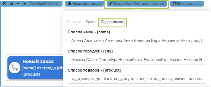 В виджете есть шаблон текста с переменными [name] , [city] и [product]. В них будут отображаться случайные значения из списков, которые задаются в настройках компонента: