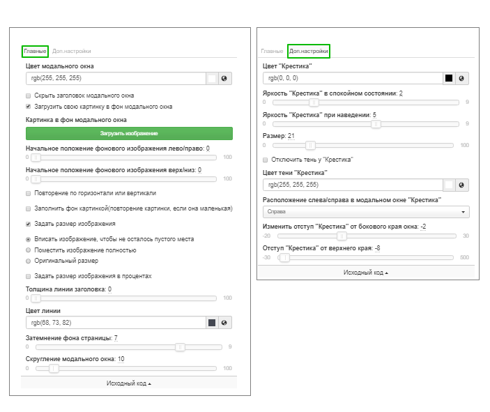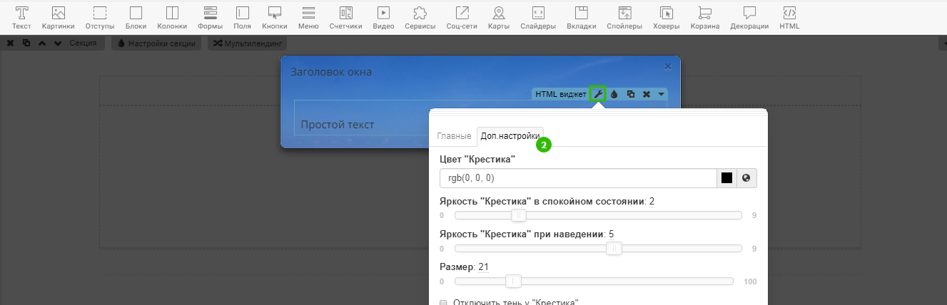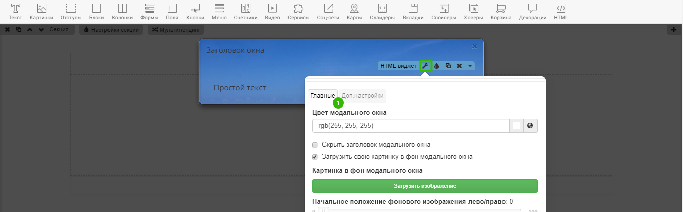 Теперь при клике на "Гаечный ключ" в виджете HTML-код будет доступно меню для управления модальным окном : главные настройки (1) и доп.настройки (2).