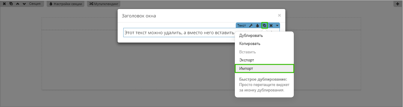Установим кнопку с окном на секцию. Откроем модальное окно и кликнем на иконку дублирования у виджета "Текст" в виде двойных квадратов (если у вас не получается, зажмите Shift при клике на двойные квадраты для доступа в меню экспорта/импорта):