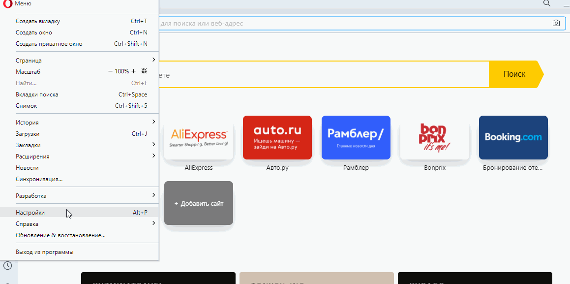 Перейдите в раздел настроек браузера в верхнем левом углу.