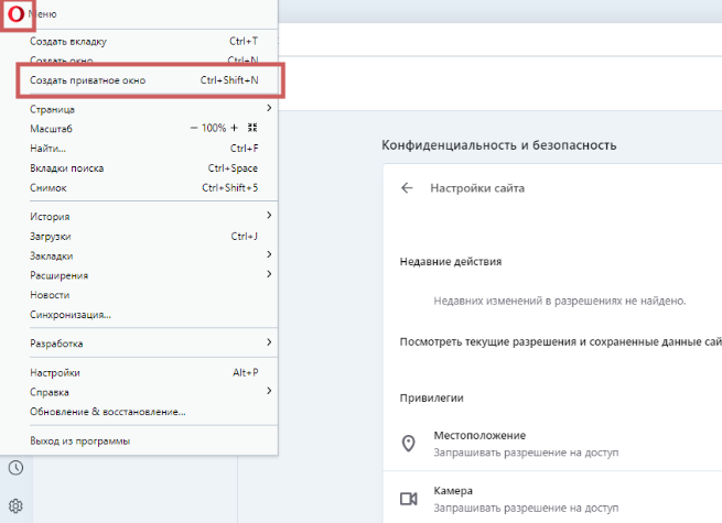 - Opera - в верхнем левом углу нажимаем на логотип браузера, далее выбираем «Создать приватное окно»