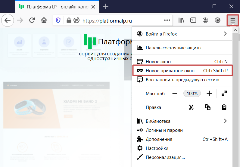 - Mozilla Firefox - в правом верхнем углу кликаем по кнопке «Открыть меню», далее находим пункт «Новое приватное окно».