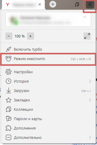 - Яндекс - в верхнем правом углу нажимаем меню и далее выбираем «Режим инкогнито»