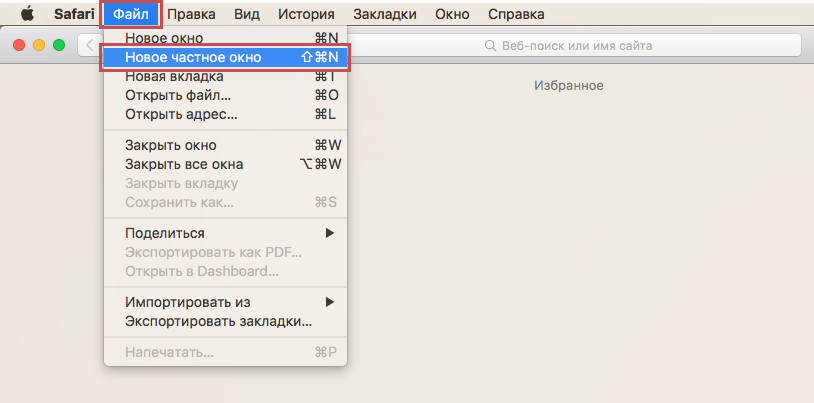 - Safari - в верхнем меню кликаем по первому пункту «Файл», далее выбираем «Новое частное окно»