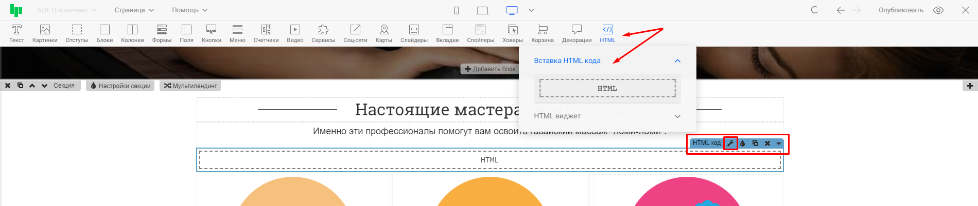 2. Код можно добавить в редакторе страницы с помощью виджета «HTML код»: