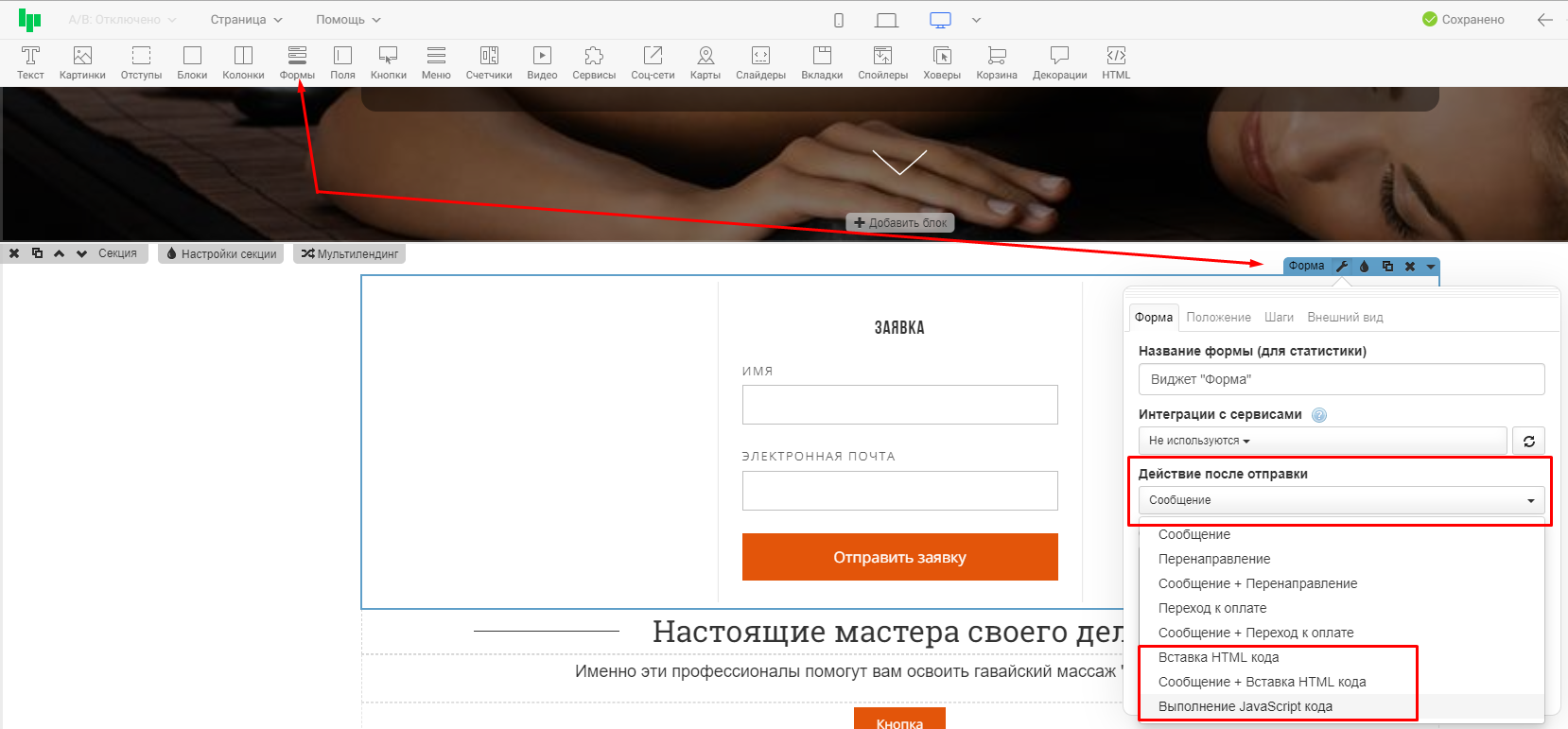 3. При необходимости выполнения кода после отправки заявки, вы можете разместить его в настройках формы: