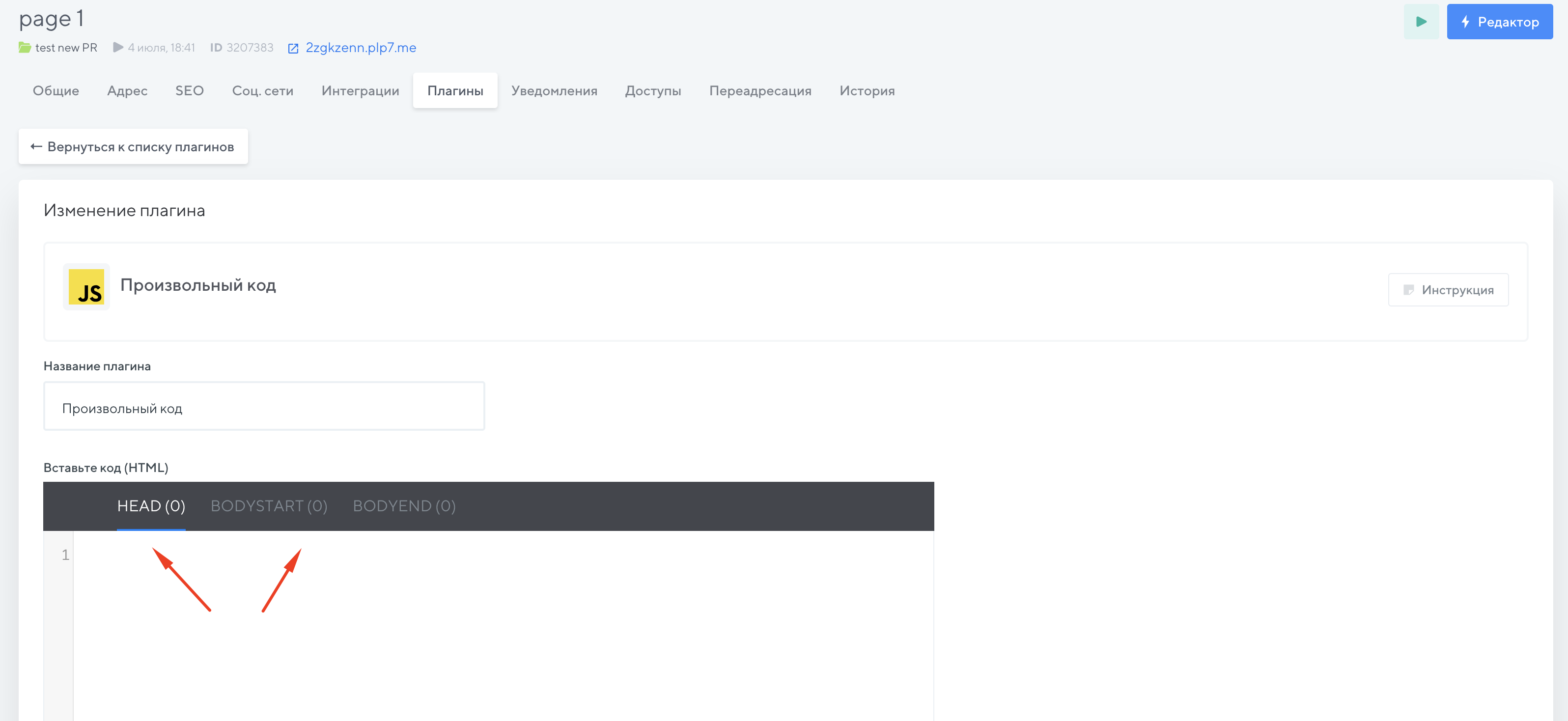 1. В настройках страницы, в разделе «Плагины», плагине «Произвольный код», поля "Head" или "Body":