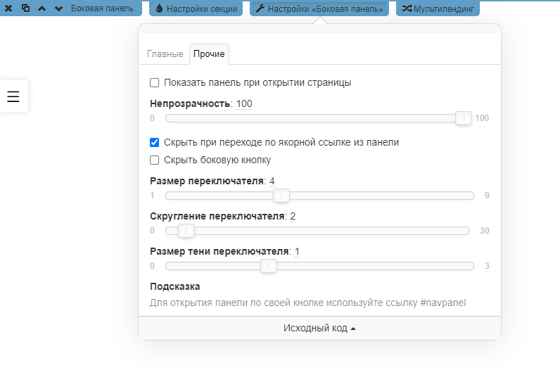 • Скрыть боковую фиксированную кнопку, чтобы открывать панель по своей кнопке, указав у нее ссылку #navpanel