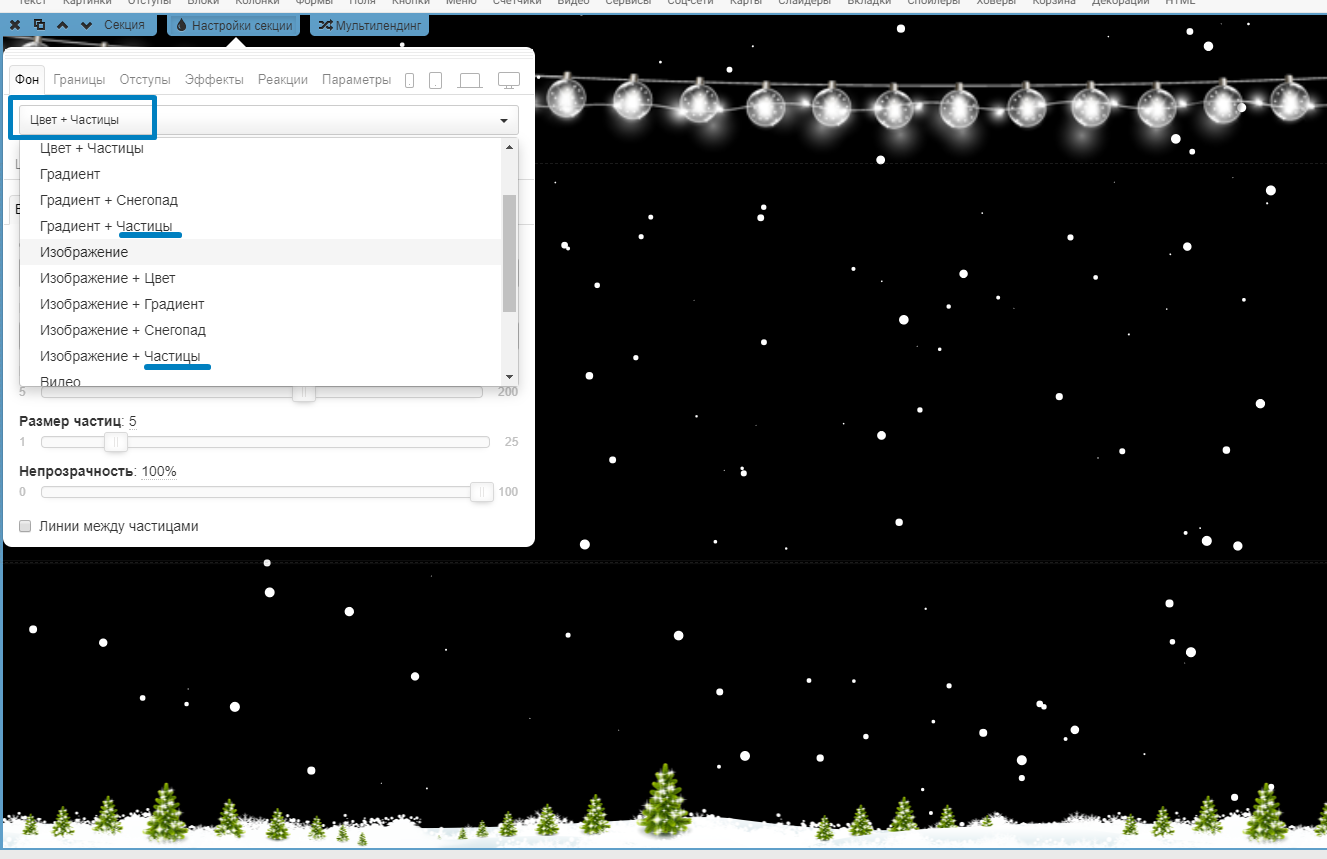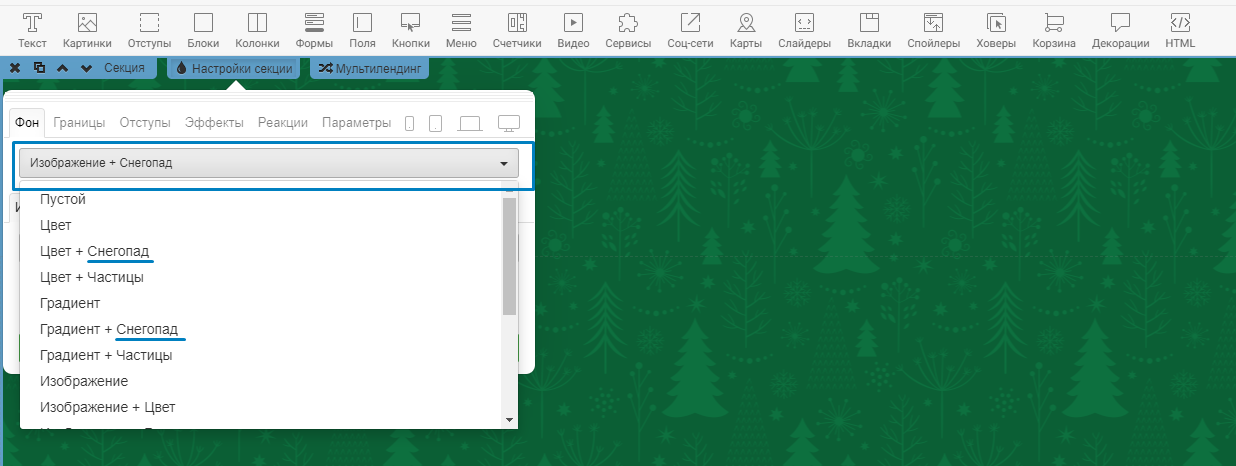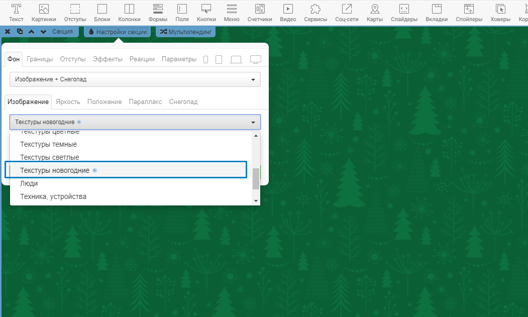 Так же можно использовать новогоднее видео, которое доступно для загрузки в фон секции или как отдельный виджет. Подробнее: