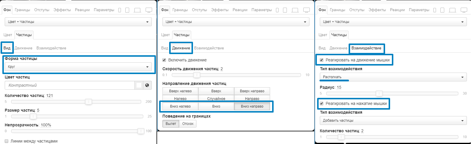 - Обратите особое внимание на настройку "Частицы". С их помощью можно настроить не только падение снега, но и взаимодействие с ним: