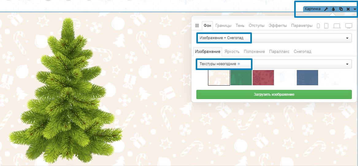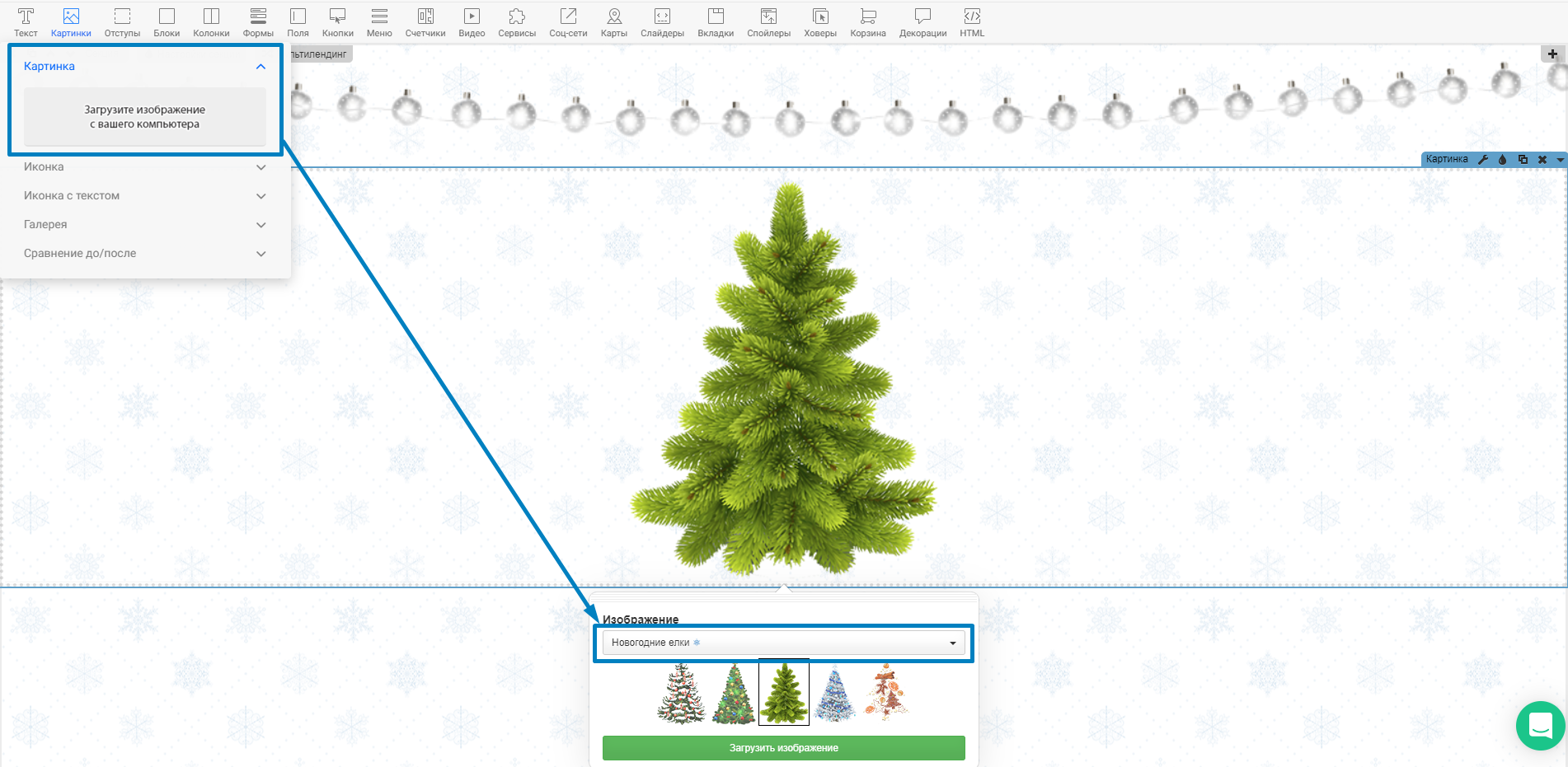 Для этого используем виджет "Картинка". Переносим его в желаемое место и среди стандартных разделов находим "Новогодние ёлки":