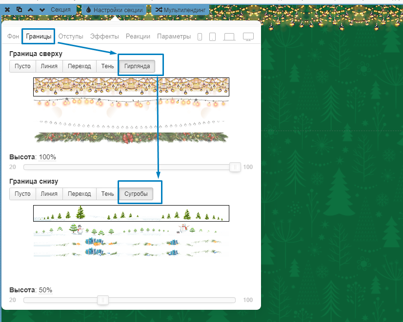 - В разделе "Границы" можно найти различные гирлянды и сугробы: