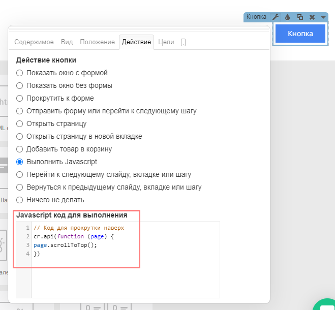 По умолчанию у кнопки установлен код для прокрутки наверх по клику: