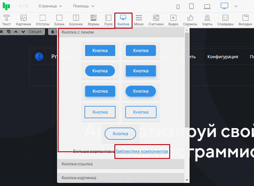 В редакторе страниц вы можете найти ссылки на библиотеку компонентов, в которой содержатся нестандартные виджеты.