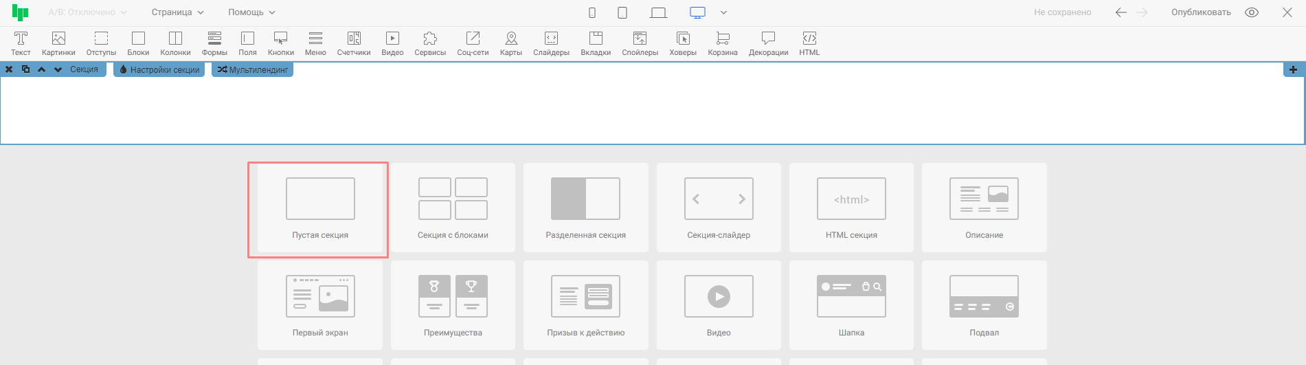 Далее - размещаем любую секцию (например, «Пустая секция») в желаемом месте на странице.