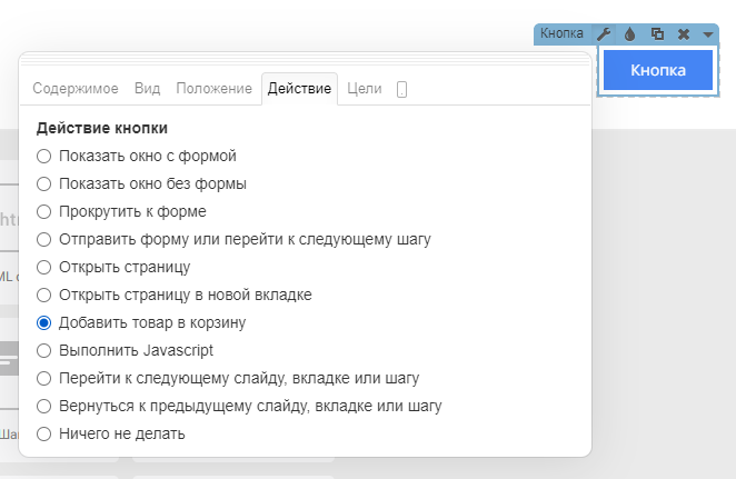 Если вы хотите, чтобы кнопка выполняла другую функцию (например, отправка заявки или добавление товара), то просто переключите «Действие кнопки »: