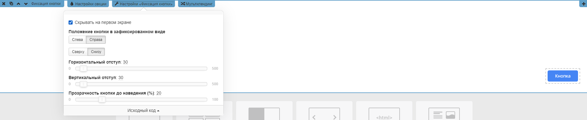 Важно: настраивать самую секцию (её фон, отступы и т.п.) не нужно, потому что на опубликованной версии страницы она отображаться не будет. Сконцентрируемся на самой кнопке, её расположении и функционале.